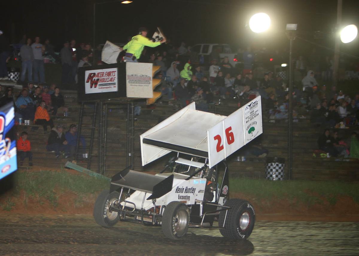 With a pair of runner-up finishes in the first two races of the season, Santa Claus, Indiana’s Ryan Tusing knew a victory was imminent. Although, by rule, Tusing had to start his Kevin Huntley Excavating sprinter twelfth, he worked the top shelf smoothly, taking the lead from Luke Bland in traffic. Bland held onto second at the finish, ahead of John Paynter Jr., while Andy Bradley took fourth, with Kendall Ruble fifth. Winning the Brandeis Machinery RaceSaver Feature, Tusing collected a $150 bonus.